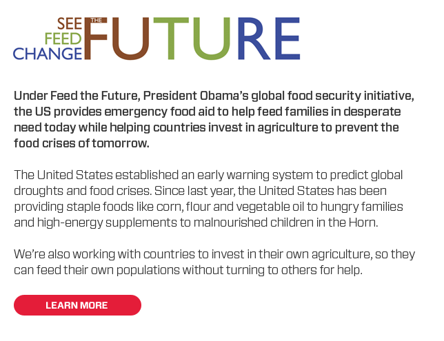 Under Feed the Future, President Obama's global food security initiative, the US provides emergency food aid to help feed families in desperate need today while helping countries invest in agriculture to prevent the food crises of tomorrow.