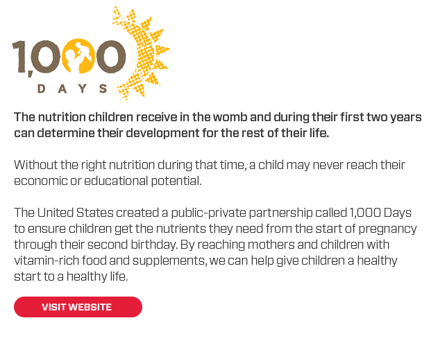 The United States created a public-private partnership called 1,000 Days to ensure children get the nutrients they need from the start of pregnancy through their second birthday. By reaching mothers and children with vitamin-rich food and supplements, we can help give children a healthy start to a healthy life.