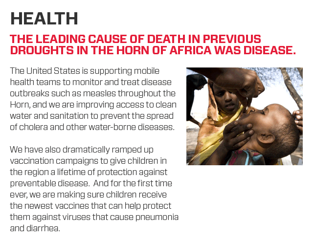 The United States is supporting mobile health teams to monitor and treat disease outbreaks such as measles throughout the Horn, and we are improving access to clean water and sanitation to prevent the spread of cholera and other water-borne diseases.