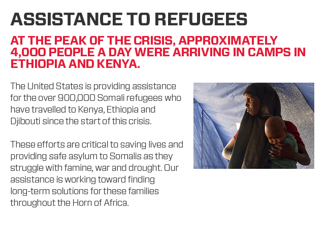 The United States is providing assistance for the over 900,000 Somali refugees who have travelled to Kenya, Ethiopia and Djibouti since the start of this crisis.