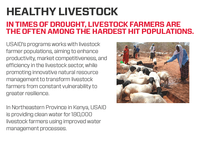 USAID's programs works with livestock farmer populations, aiming to enhance productivity, market competitiveness, and efficiency in the livestock sector, while promoting innovative natural resource management to transform livestock farmers from constant vulnerability to greater resilience.